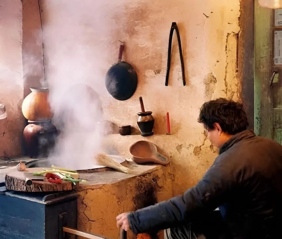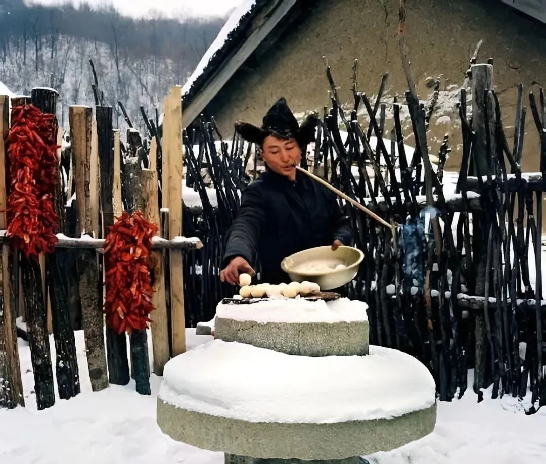 图上这圆墩墩的石台是石碾墩当案子使,男人叼着长烟袋翻烙饼,面团一个个摆在边上,火苗被北风一撩就直窜,手背上全是面粉印子,烙出来的饼外焦里软,得趁热卷酸菜丝。