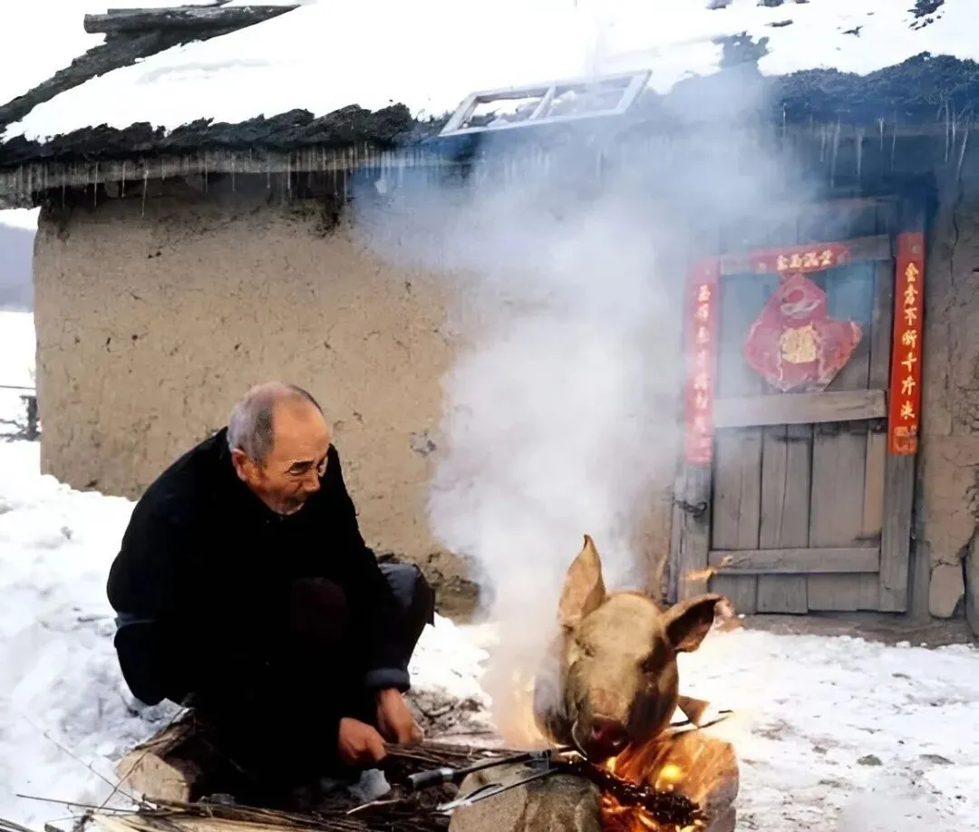 这活计叫燎猪头,老爷子蹲在门口火堆前,麦秆一挑一挑地添,猪皮被火一过就起泡,焦香冲鼻,奶奶在屋里喊,小心点,别把门帘子烧了。