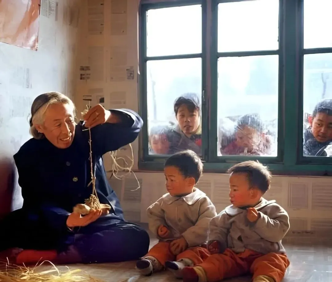 这个草绳团叫捻麻绳的活计,奶奶手指一旋,细股就成了粗绳,俩小家伙在炕头坐得直摇脚,窗外的孩子扒着玻璃往里看热闹。