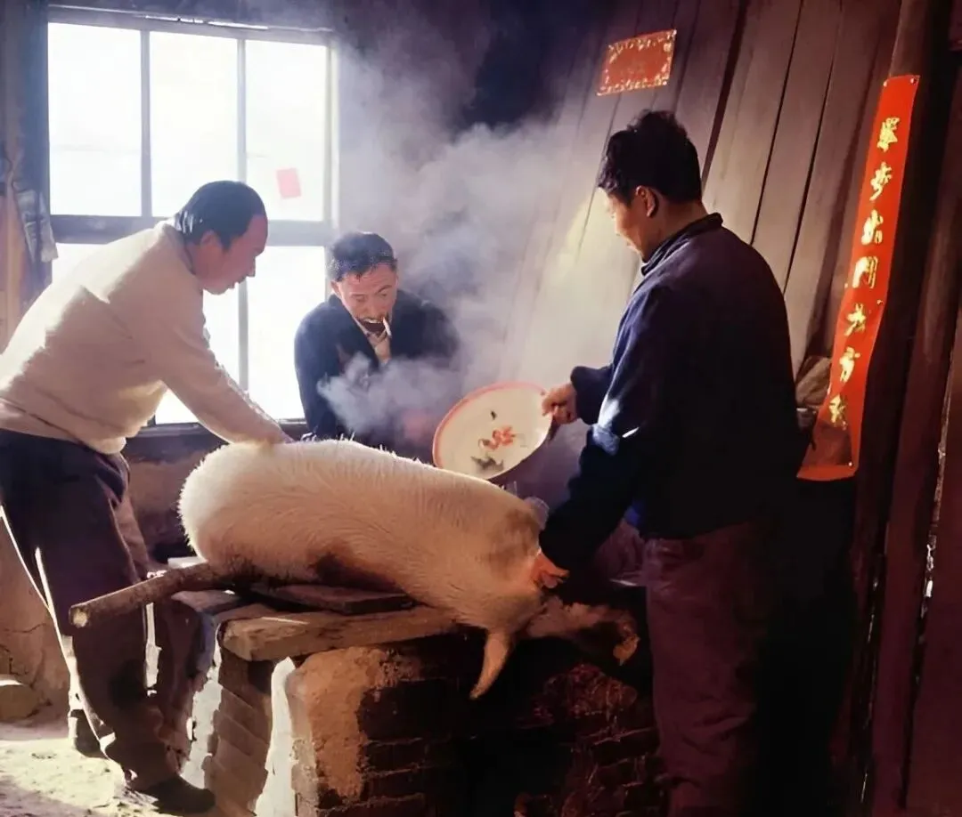 这是杀年猪的场面,男人们按腿、接血、烫毛,各有分工,墙上贴着红对联,蒸汽把屋顶熏得黑亮,孩子在门口闻着香,急得直转圈。
