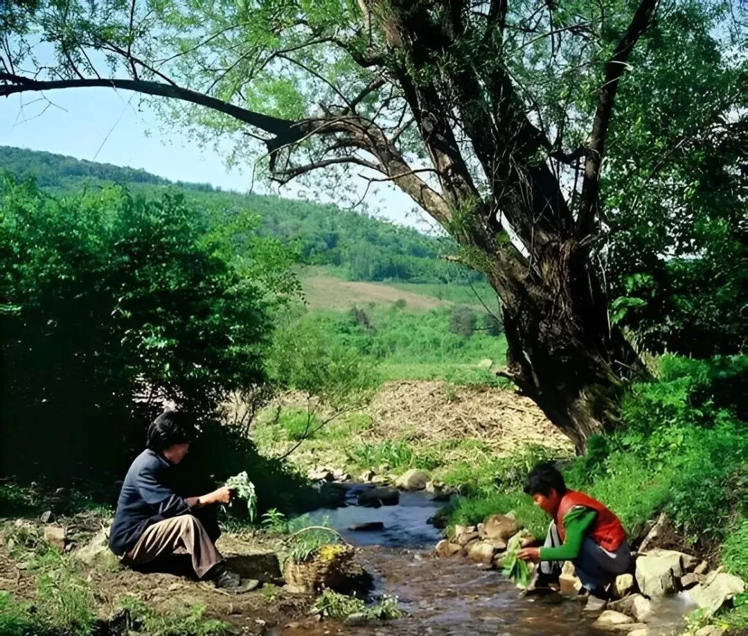这个场景最清爽,村头小溪里洗大葱和芹菜,水哗啦过手,菜叶子绿得发亮,篮子靠在石头上晒一会儿,午饭就有一大盘子凉拌菜。
