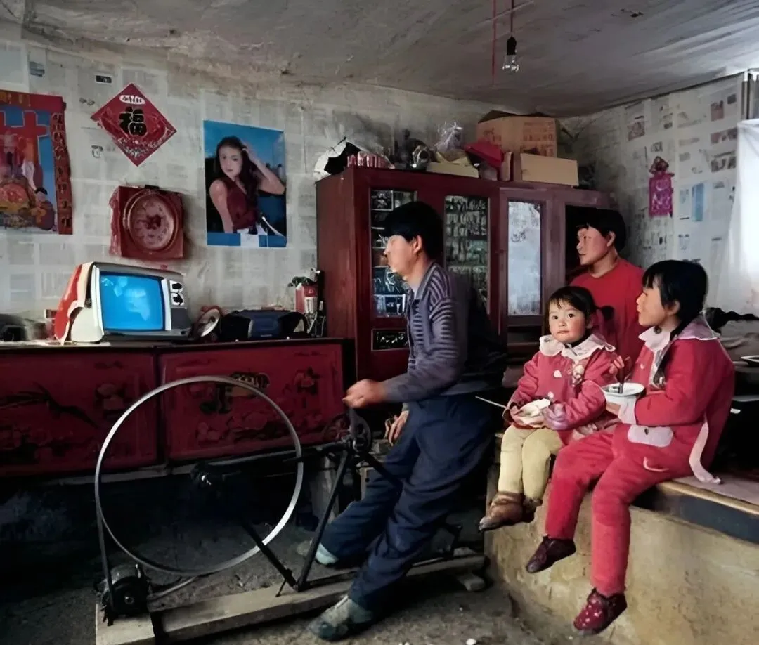 这台奇招叫脚蹬发电,停电的夜里爸爸踩着飞轮,电视里蓝屏一亮,三四个孩子蹦上炕沿坐成一排,动画片一出来,全屋子都不想说话了。