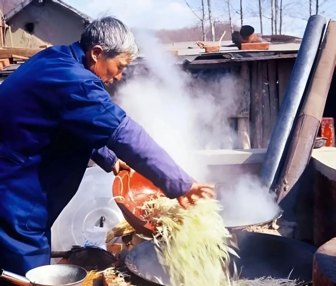 这一口大铁锅是喜事大灶,师傅搂着勺往里一倒,酸菜丝在油里嗞啦一炸,蒸汽遮住了半边脸,旁边一排碗等着出菜,香味能飘到胡同口。