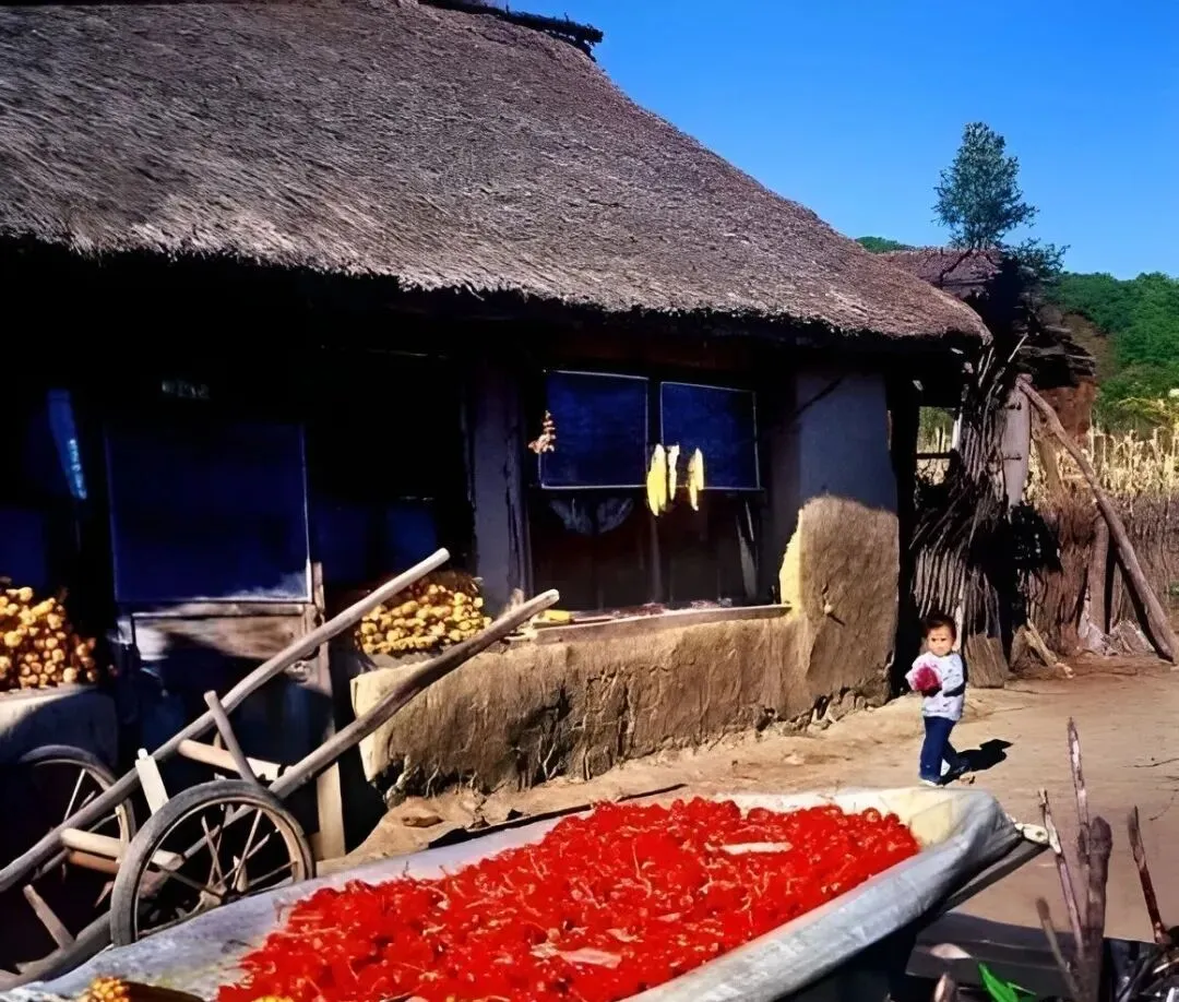 这座茅草屋前堆满晒辣椒,一红一片,像铺了毯子,车把式的平车靠在墙下,太阳狠的时候,辣椒表皮收成小褶,晚上得用苫布盖住。