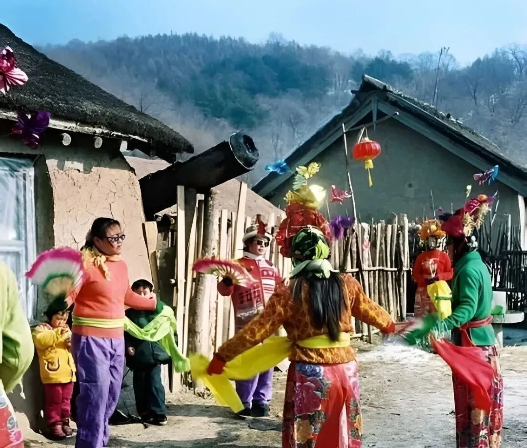 这身花里胡哨的是大秧歌,彩扇一抖,腰带一甩,锣鼓咚咚,院口堵得水泄不通,年节就靠这一拨人把气氛顶上去。