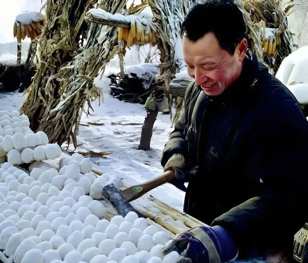 这些白乎乎的是粘豆包,先蒸后冻,一排排摆在屋外,男人抡小锤子咔嚓敲下来,落在筐里像小雪团,煮一锅蘸糖吃,谁都舍不得只吃一个。