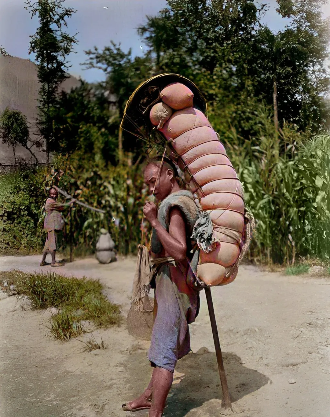你看背上的大捆,不是随手一捆那么简单,粗麻绳一圈一圈勒紧,里头多是稻米或杂粮,外面再裹一层旧蓑布防潮,弯月似的弓背形状,是为了让重心往上靠,山道窄,背夫身体得向前探,脚趾抓地,像猫一样走,停下时杵一撑,人不塌,气不散,这就是门道。