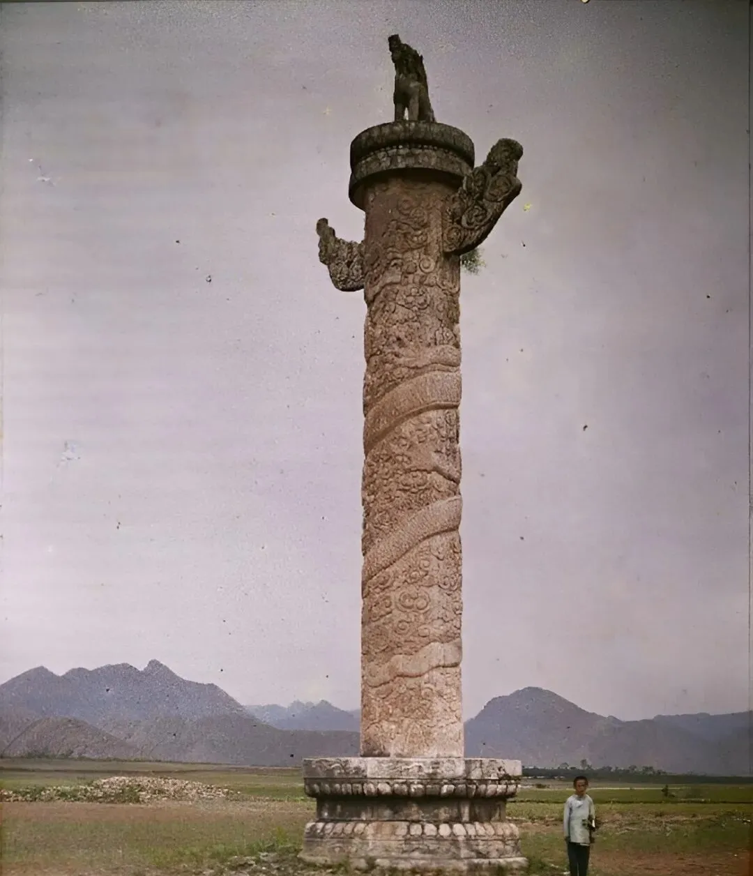 图中这座高大石构叫石牌坊,五间六柱十一楼,汉白玉立在地平线上,一下子就把气势立住了,柱础上云龙翻滚,檐下斗栱一层压一层,那时候彩绘还在隐隐能看出底色,路边没护栏没游客,只有风把草穗吹得歪一片。
