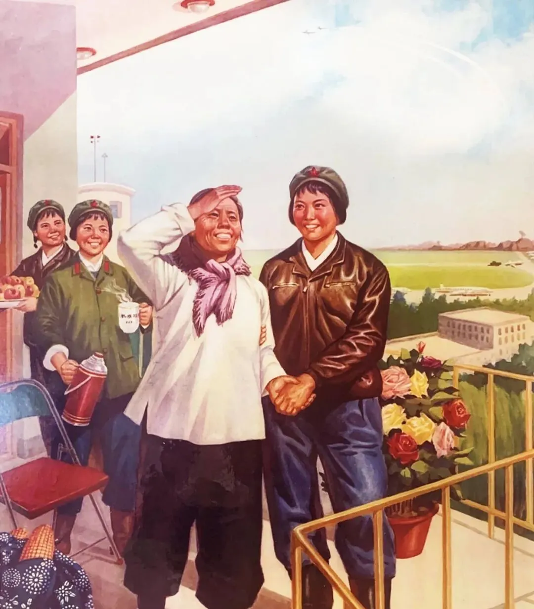 这个场景家常,阳台上花盆红黄一片,招待员端着铝壶冒着热气,老大娘眯着眼朝天上看,手搭在额前,笑纹像阳光下的河纹,飞行员握着她的手,袖口油渍没擦干净,妈妈说这种场面她见过,那是真心相待,不是摆拍。