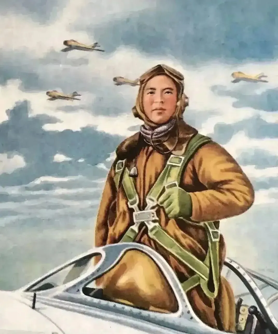 这张是最“神气”的一幅,棕色皮夹克,灰绿色背带,旁边机群排成梯队从云里冲出来,左下角机翼扫过的光影像刀口,画师把风也画出来了,袖口鼓一鼓,年轻的脸就像刚擦过机油。