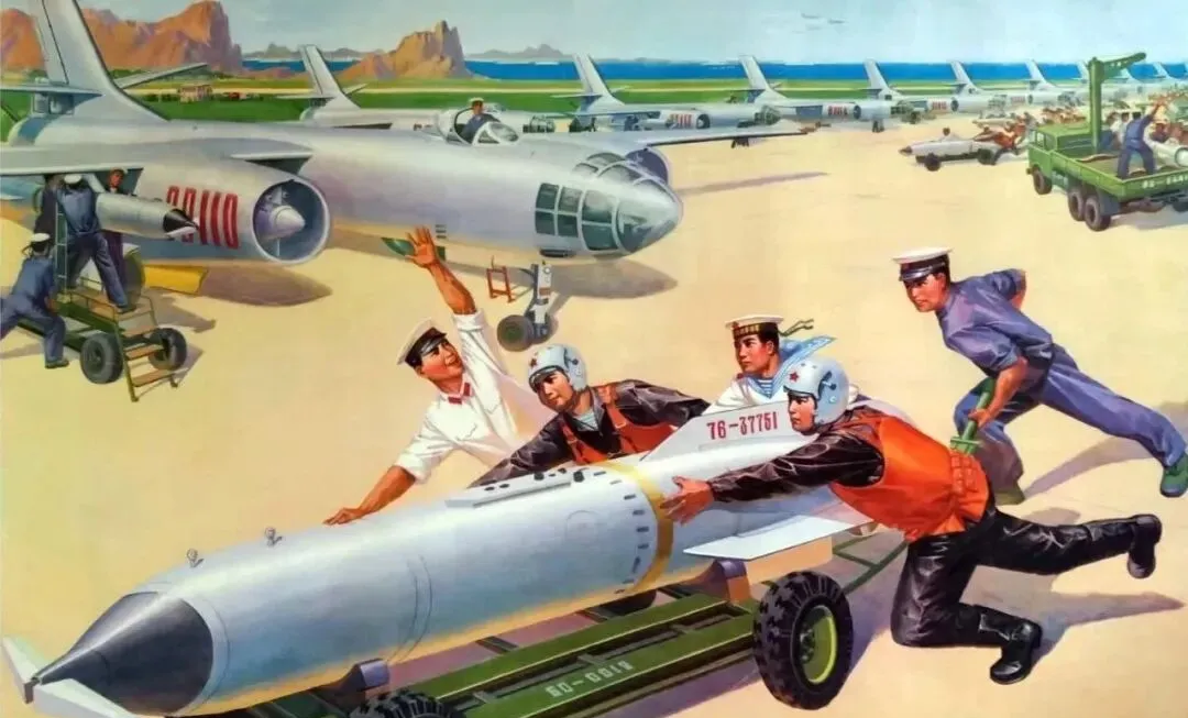 这个大个儿叫航空炸弹,灰壳子,头尖肚圆,拖车是绿漆钢架,几个人一推一拉,轰五机腹下挂点整整齐齐,背景一溜机群晒着铝光,舅舅说装挂的时候最讲究规矩,扳手一号对一号,螺帽几道纹都记得清清楚楚,不然上天就是大事。