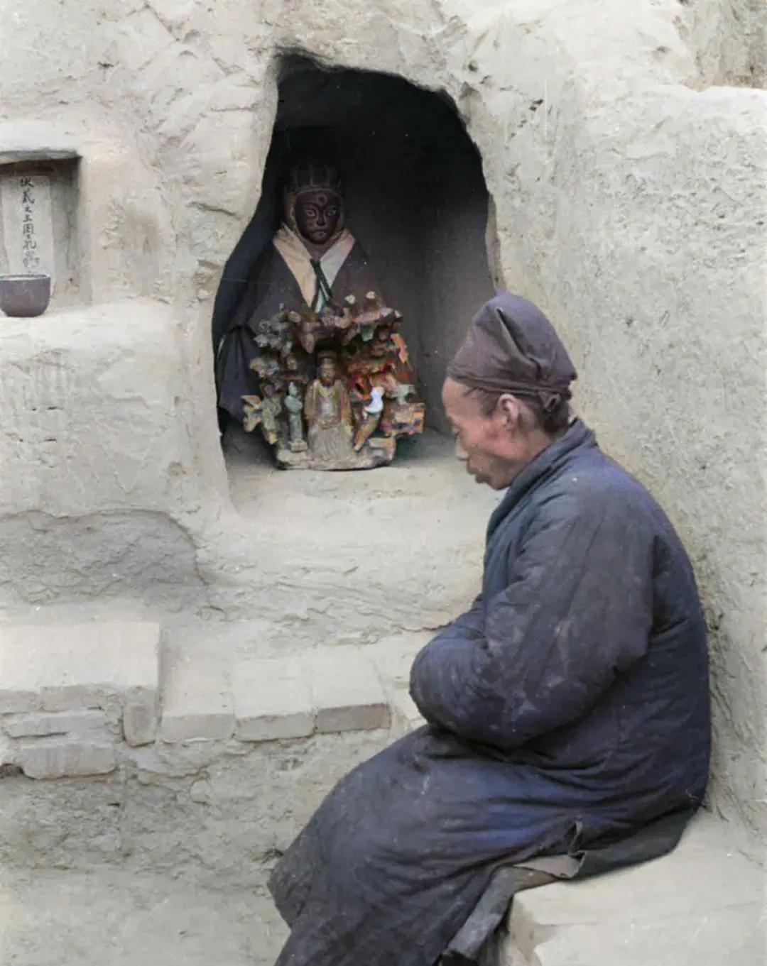 你家见过这种土崖里的小龛吗,别看简陋得很,却能装下半个村子的心事,这张老照片里的人打着盹儿坐在台阶边上,袖子一插就像兰州冬天的风一停就静下来了,最抓眼的是龛里的神像居然三只眼,一下把人拽回到那会儿的黄土高坡和西北风里了。
