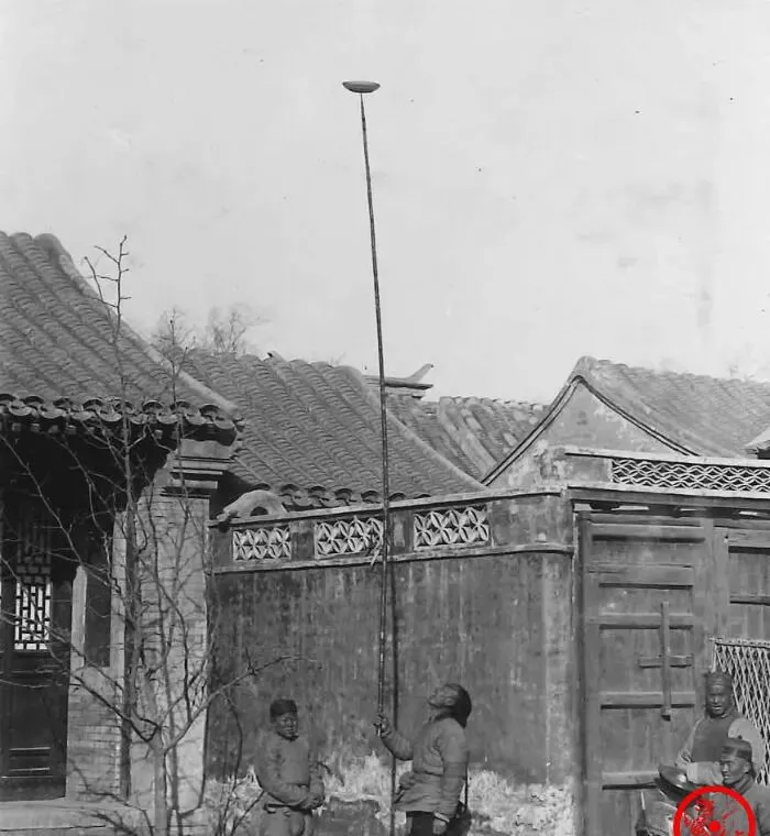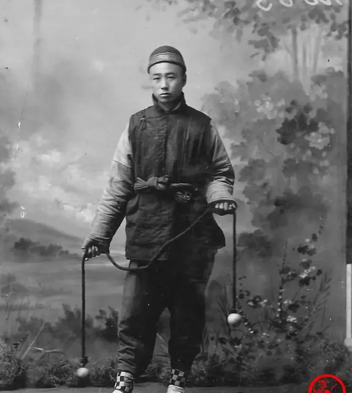 这个活叫射星,两头拴木球,中间是一条粗麻绳,双手一抡,两个球就往相反方向飞起来,嗡嗡的风声把绳子拉直了,他只用手腕抖三抖就能把转速吊住,忽然往上一抛,球花在半空交叉一回又落回原位,师父说这玩意练的是腕劲和眼神,年轻时一练能一口气转半个时辰。
