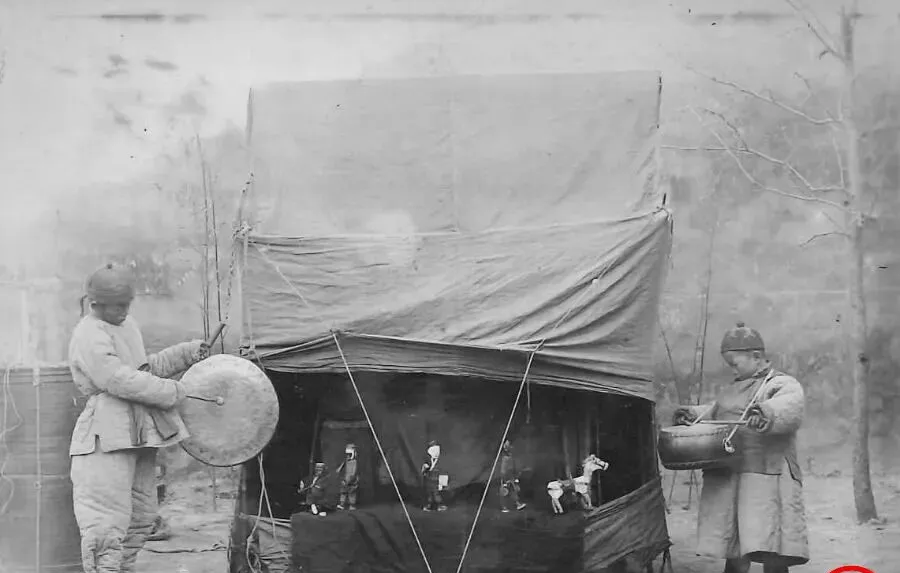 这个小棚子里演的是提线木偶,黑幕一拉,马跑得滴溜溜,士兵抬枪过桥,线细得像蛛丝,操纵的人蹲在后面,十指分工,食指管头,大拇指拎着身,偶尔一个失手,木偶歪头冲观众笑,台下的小孩“哎呀”一声,锣一打又把场面圆回去,旧社会里逢庆都要搭这么一棚,红火两天,赚的不多,图个乐。