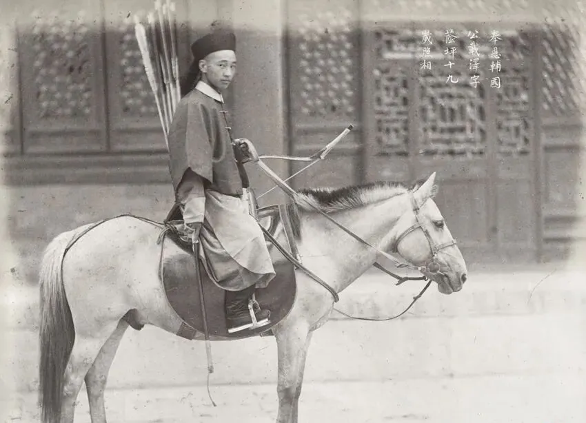 图中这位瘦削少年就是载泽,清装骑在白马上,背上插着箭壶,腰间坠刀,马鞍是厚皮面,缰绳收得紧紧的,脸上还带着点稚气,那会儿他十九岁左右,练的是八旗子弟的老本事,骑射合一,宫墙灰影里跑一圈,回来说一句“还得多练”,家里长辈就点头说行了。