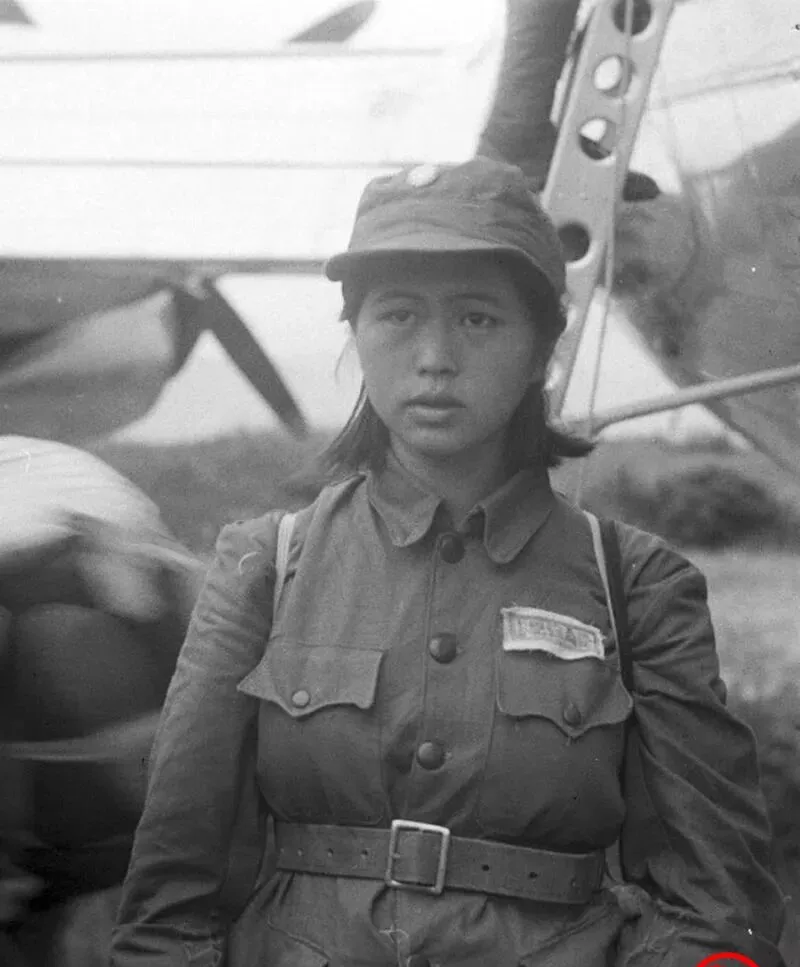 图中这身旧军装叫行军常服,粗棉卡其面料,胸口两个贴袋,铜扣排得直直的,腰间一条皮带把人勒得板板的,帽檐压低了些,边上就是飞机的机翼支架,圆孔一排像吹口琴,风从孔里穿过去,呼啦呼啦直响。