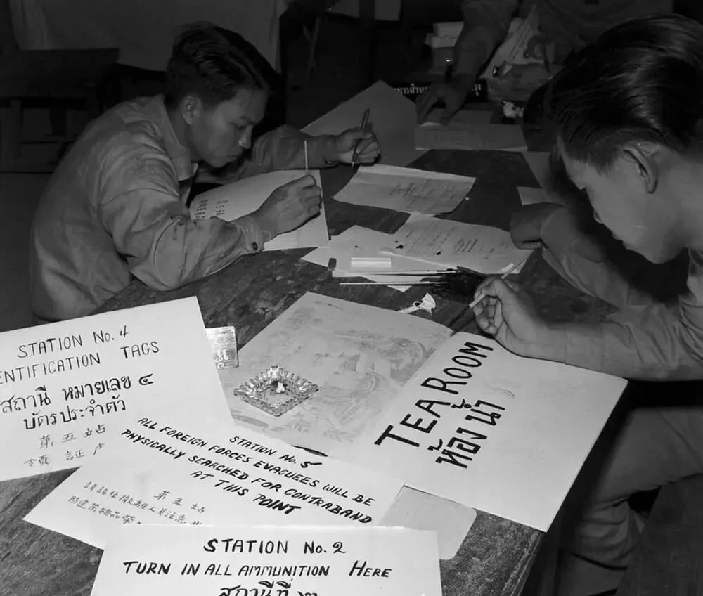 桌上这些纸牌就是撤离指示,英文、缅文、中文挤在一块,黑墨水沾到指尖上,写牌的人把小臂撑在桌沿,笔锋蹭出毛边,旁边用铅笔画了箭头,指去站点,灰尘往上扬,灯头冒着小小的嗡声。