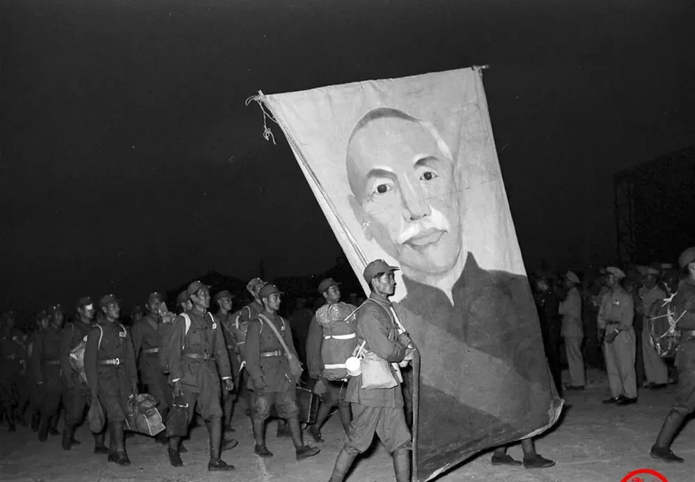 这块大旗还是那张画像,不过换到夜里更扎眼,抬旗的人胳膊绷得直直的,肩上绑着白布条,背后水壶铁盆乱响,脚步却整齐,黑漆漆的背景里,只有旗子像一团活火,往前拱着走。