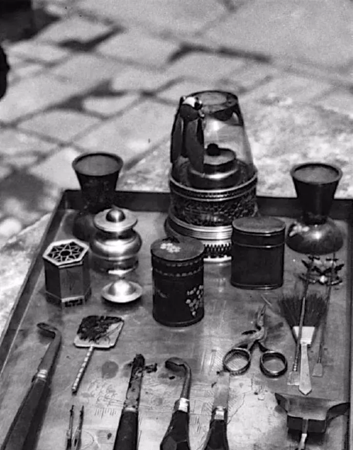 这个一盘叫烟具搭子,漆托盘里摆满家伙什儿,玉色的小烟盅,黑漆圆罐装烟膏,细刷子是掸灰的,铜剪子用来修烟灯芯,弯嘴短烟管是练火的,钢片小铲能把烟膏摊得薄薄的,摆起来挺雅,动起来全是门道,手慢半拍就糊了,味道就变了。