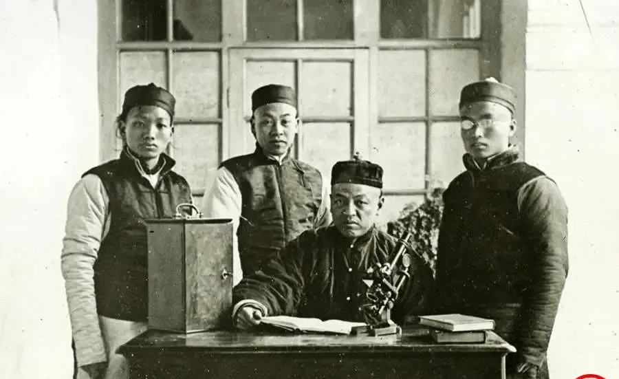 图中木盒旁的黑色小管子叫显微镜,旁边摞着洋书,老师目不转睛地翻页,几个学生站在侧后等着演示,这种课进了新式学堂才有,先在酒精灯边消毒载玻片,再把样品放上去,对准镜筒一下一下拧焦距,第一次看见细胞那会儿,估计谁都会倒吸一口凉气吧。