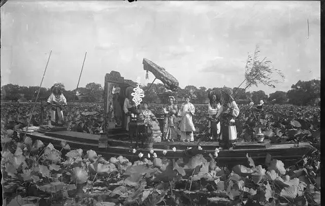 这个长条木船叫画舫,撑篙的在船尾,船舱里挂帘搭案,水面全是荷叶子,风一吹沙沙作响,随行的人手里提着供具和扇子,走走停停,像把夏天装在了相纸里,奶奶看见这张说当年“逛园子讲究的是个慢字”,现在出门一脚电梯一脚车门,风景都让车窗划走了。