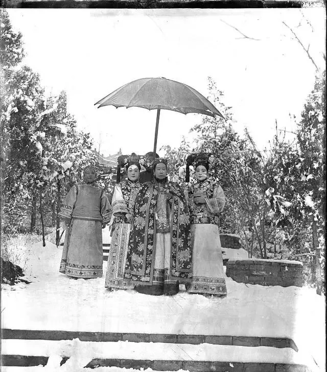 这个场景最有趣,图中两侧是洋装长裙,帽檐上扎花,腰上束带紧紧的,中间是满绣的朝衣,领口高起盖住下颌,扇面圆圆压在手心里,东西两样打在一张底片上,居然也不冲突,时代挪腿走得慢一点,镜头就能把这种“并排”留住。