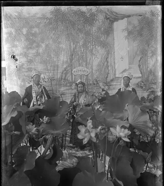 这个布景学名莲台,前檐摆满荷叶荷花,人坐在中线,头顶冠饰花片一层叠一层,后幕画竹林与山径,显然是特意搭的影棚,爷爷看着笑,说早些年乡下照相馆也爱摆假山假花,先装境,再进人。