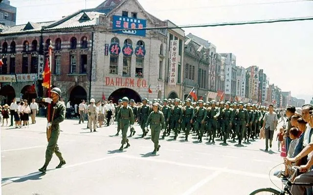 这个场面叫操演队列,密密匝匝的年轻人穿着蓝呢制服或军装,帽檐压得低低的,脚步对着拍子往前赶,旗面一晃一晃,街口围着看热闹的百姓,人群里小孩儿骑在大人肩头瞧个够,那时候流行站在路边数口令,现在谁还停下脚步看队列走路。