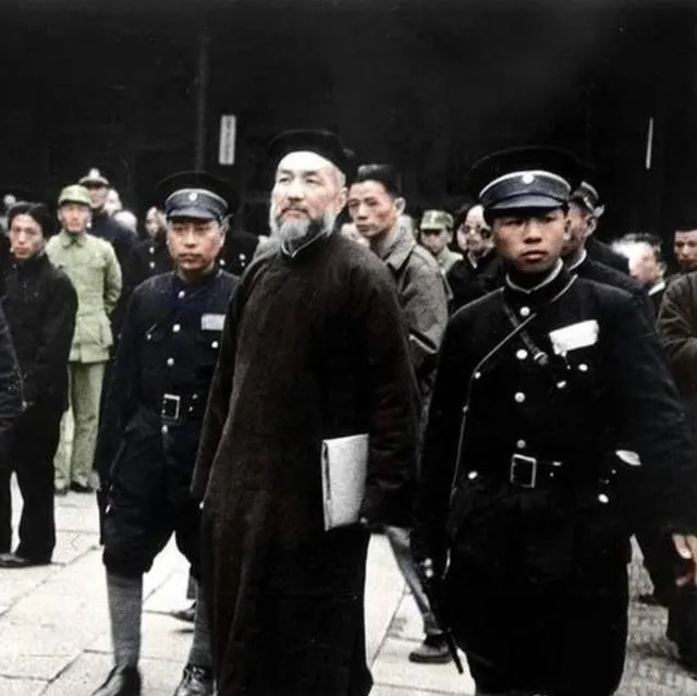 画面中间这位胡子花白,穿长袍马褂,被警员簇拥着往前走,袖里夹着一本册子,目不斜视,围观的人把街口挤得满当当,场面不吵,却有股子压着嗓子的紧张。