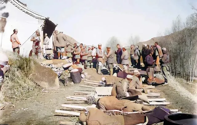 院墙根下站了一排人,棉袄扎着腰带,脚上绑草鞋,手插在袖筒里取暖,冬日的冷一吹,太阳底下也不过是暖一点罢了,镜头里的笑是硬扛出来的。