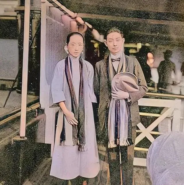 码头扶梯边,两人各挂一条长围巾,男生手里捏着一顶礼帽,女生穿着宽袖长衫,脸色被海风吹得白里透红,旁人忙着搬运行李,他们忙着把这一刻塞进相纸里。