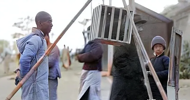 这张有点冷,一只木笼吊在架子上,旁边的人神情复杂,风从旷野里钻过来,吹着衣角猎猎响,历史有时候并不体面,照片把不体面留住了。