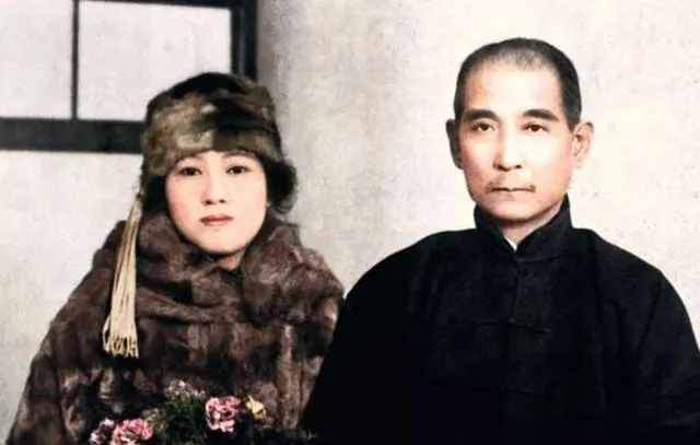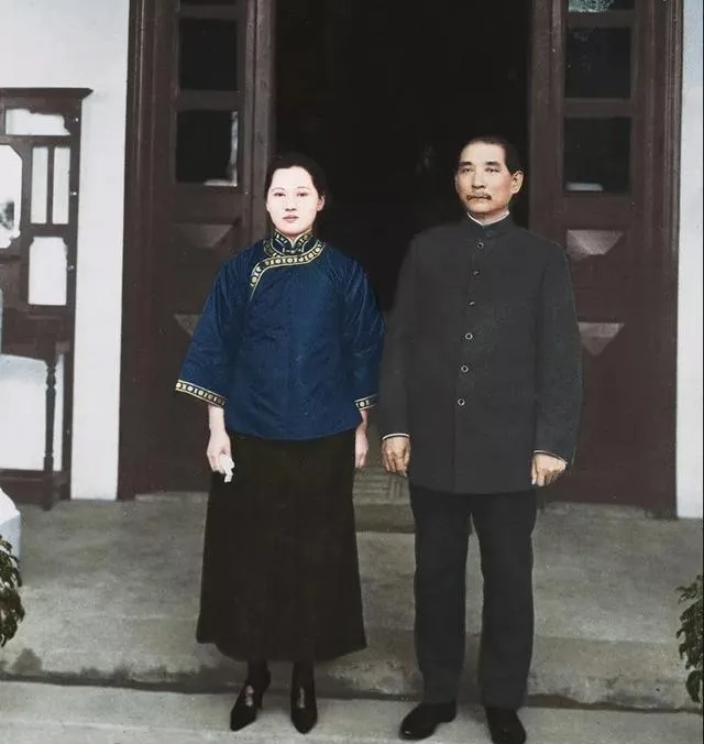 这对坐在园子里的长椅上,军装扣到最顶,夫人穿旗袍,手叠在膝上,表情放平,像是刚聊完家常准备进屋吃饭,快门按下便成了一种郑重。