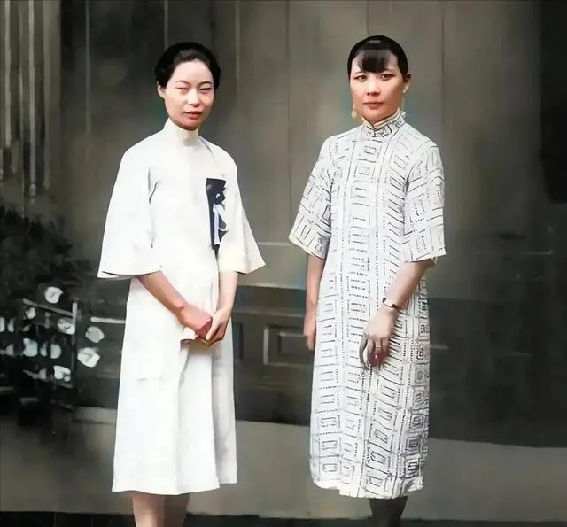 两位站在门前,左边素白旗袍只在胸口点一块纹样,右边几何格纹铺满全身,耳坠轻轻晃着,风从袖口绕过去,带起一点清香似的。