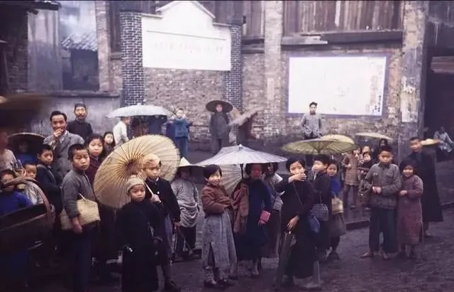 十几把油纸伞在巷口撑开,孩子抱着小篮子踮脚张望,墙上贴着褪色的告示,脚边一滩水把人影拖得老长,谁家买盐谁家丢了鸡,全在这一地闲话里散开。