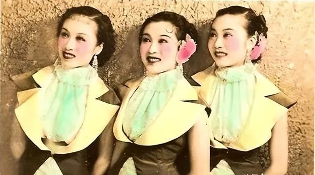 这三位肩靠着肩,脸颊上点了粉红,发间插花,衣领叠出几层浪,笑的程度各不相同,像商量好的,姐姐稳,妹妹灵,合在一起就是各有各的好看。