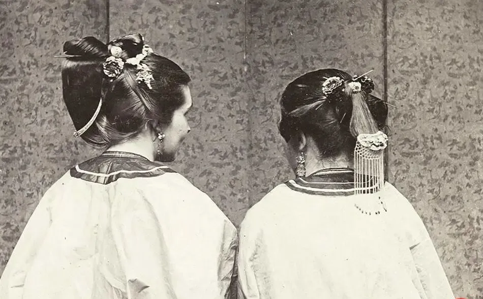 图中这对背影最抓人眼睛的,是左边的帆船髻,发面被油梳得亮亮的,额前不留一丝碎发,后脑勺起一道半弧,像鼓起风的船篷,簪花压着,发夹稳稳卡住,右边则是燕尾加盘髻的做法,尾端分两杈垂下,银坠子一走路就轻碰后颈,叮的一声干净利落,奶奶说当年年轻姑娘出门,先看发髻再看鞋,发髻梳得净,日子也多半利索。