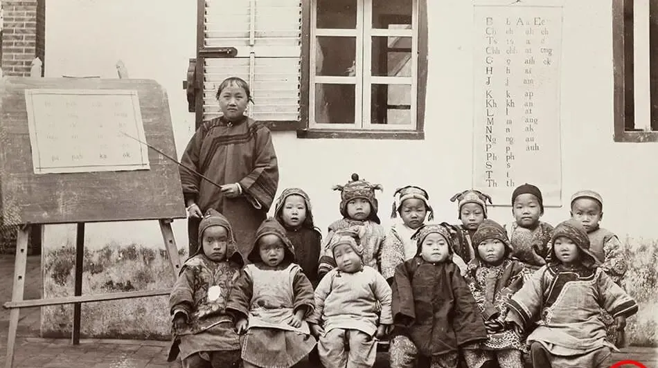 老照片:清末人物生活照,女子展示发髻,幼儿园孩子学英语。