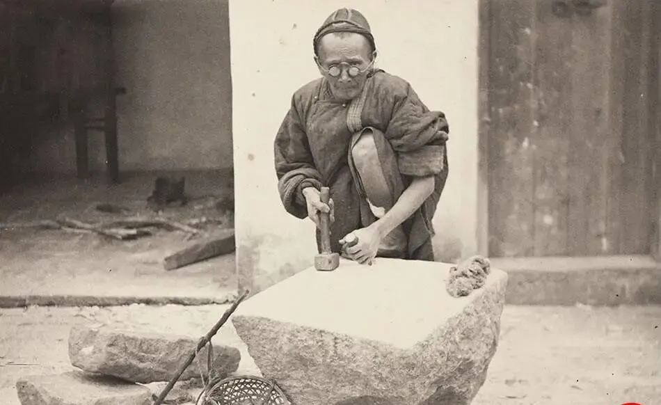 这个拿锤拿錾的老先生,是石匠,圆框眼镜卡在鼻梁上,手背筋络分明,錾子斜着咬进石面,一下半寸,一下又半寸,边角跟着立起来,敲击声在院里回荡,清脆得很,爷爷说好石头要“顺纹吃力”,逆着走就劈了口子,活计急不得。