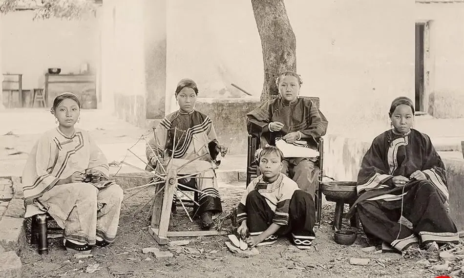 这几个姑娘坐在树荫下,左边手里捏着线团,中间的纺车转得圆圆,踏板起落,纱线在指间绕过小钩,鞋样放在膝盖上,针脚一针一针纳过去,绣花绷子被按得紧紧的,线头从背面穿出个小结,妈妈说那会儿说贤惠,不看嘴甜不甜,先看针脚直不直。