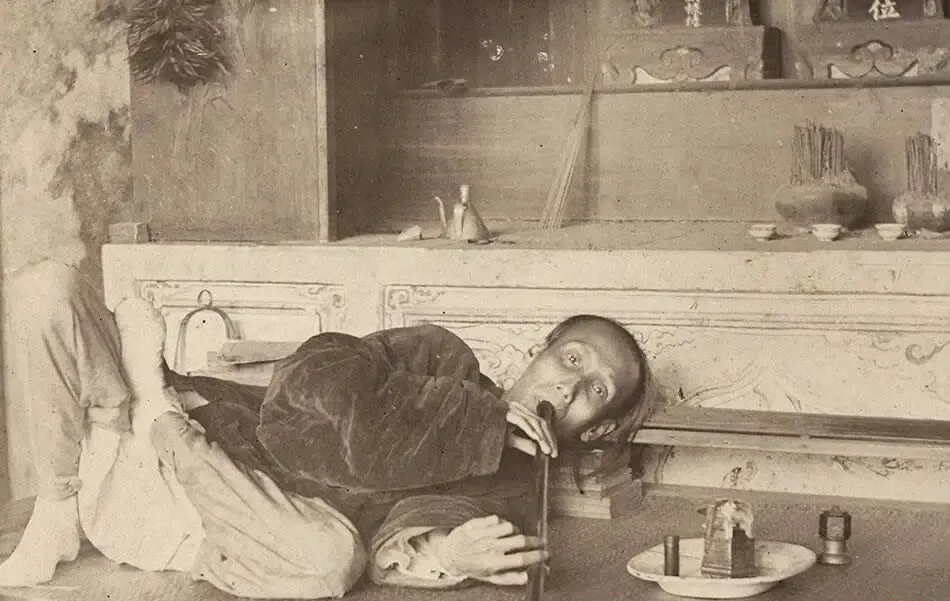 这张图不好看,却是真实,烟榻上那位枕着臂弯,眼睛直直的,手里端着烟枪,旁边小盘里码着火具,炉芯在桌沿上一明一暗,家里供桌就在身后,香灰冷着,他却沉在自己的雾里,唉,毁了身子也毁了家,一声叹气到嗓子眼里,说不出来也说不尽。