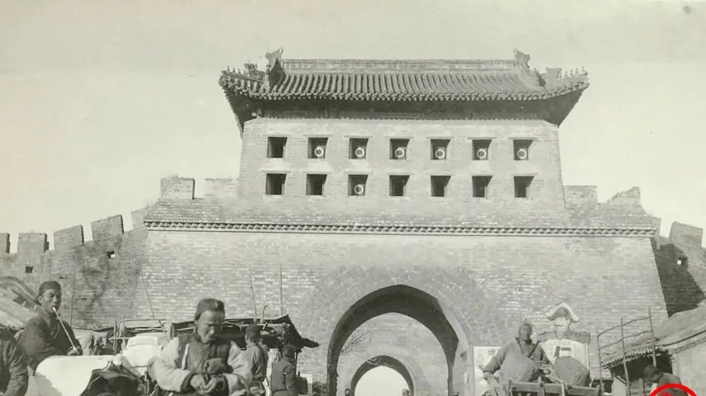 图中高起的楼体叫箭楼,青砖叠砌,檐角翘起,窗洞一排排像眯着眼的弩孔,近处车轱辘碾过土道,尘头一股脑儿往上扑,拉车的汉子裹着棉褂,嘴里叼着冷风,进出的人都急,城门却一点不着急,像老大爷靠着门框打盹儿。