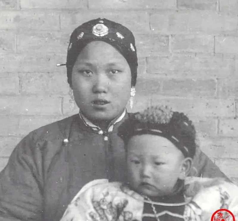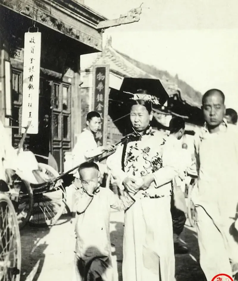 图里妇人头上那一抹宽宽的装饰叫大拉翅,绸面发亮,衣襟绣花细密,小孩攥着袖口不敢乱看,后头跟着人力车叮当响,奶奶说旗人以前每月有饷银,衣裳首饰都体面,后来一断,家底薄得快,有的把箱底清一清,能扛一天算一天。