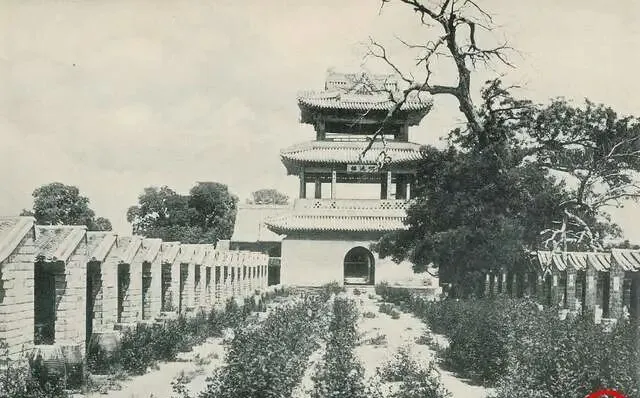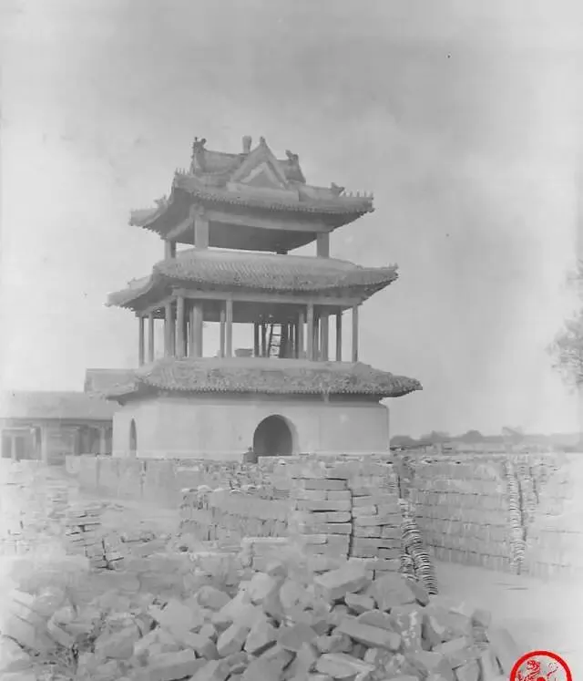 这个画面还是明远楼,右边老槐撑着阴影,左边码着高高砖垛,像给谁留的货,爷爷说,庚子那年之后,这里常能听见车轮碾石的嘎吱声,砖木一车车往外走,人们站在远处看,谁也拦不住。