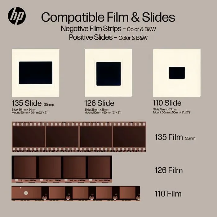 HP FilmScan主打家庭用户,提供一种相对简单、一体化的方案来数字化模拟胶片,无需依赖专业冲印服务或复杂的平板扫描仪。包装内含幻灯片支架、多种规格胶片适配器、清洁刷和USB线。