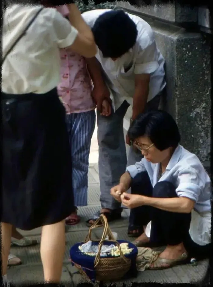 据说是1987年在上海拍到的水果店。左边招牌上写着砀山梨0.68元/斤,右边写着正宗崂山巨峰