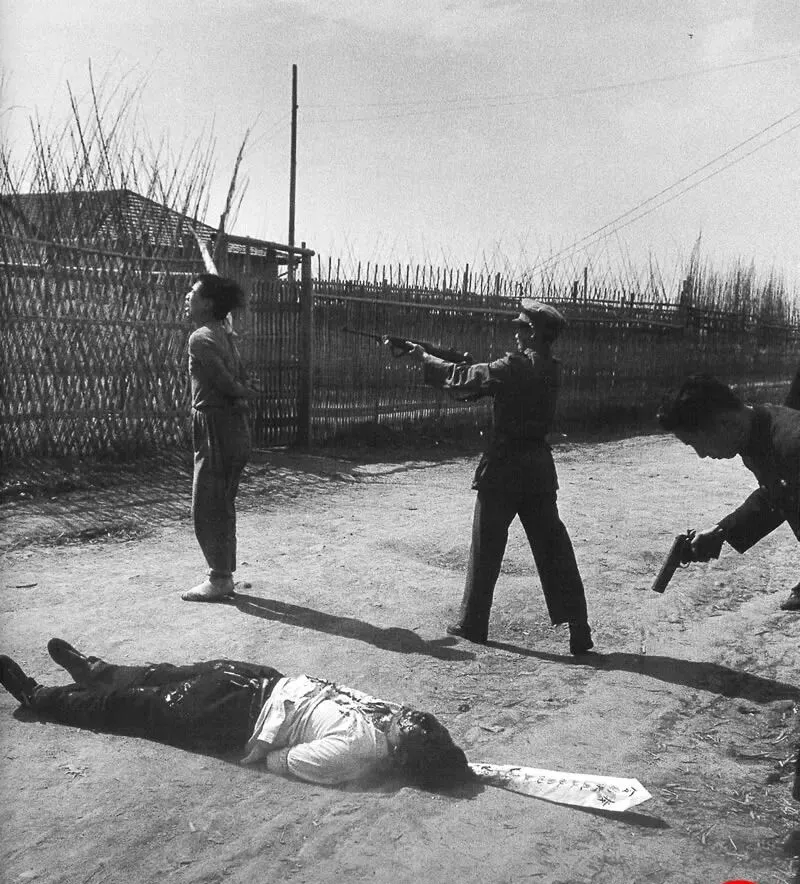 这个短身家伙就是手枪,黑亮的枪口对着太阳,执法者一手平伸,一手自然下垂,脚跟在黄土路上擦出一小撮尘,后面竹篱笆密到透不过风,枪声在照片里听不见,可你能想见那一下的干脆,地上那位已经倒下,胸前一大片黑影铺开,旁边的人弯腰检查,姿势像在拾一枚掉落的钮扣。