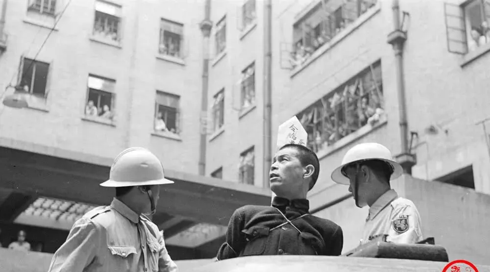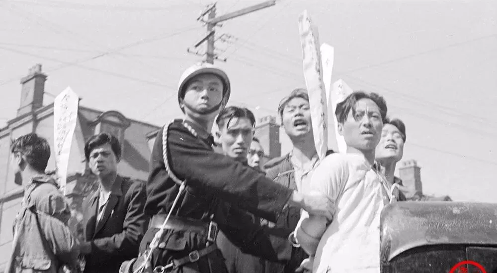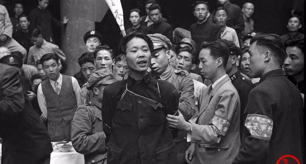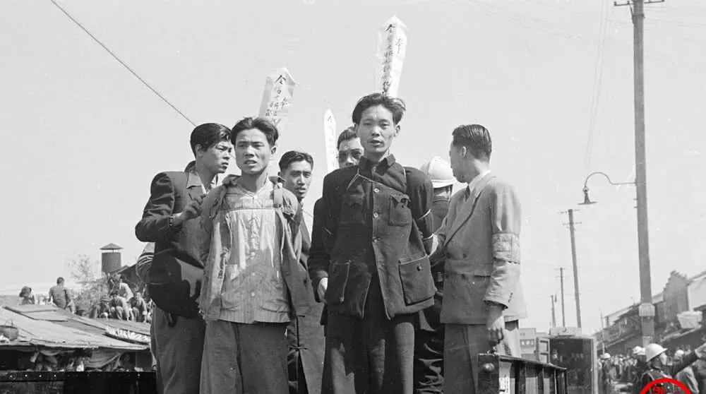 这根窄长的纸牌插在衣领后面,像一面小小的旗,宣告着名字与罪名,毛笔字顺着纸纤维渗开去,黑得发亮,风一吹便抖,照片里能看清“扰乱金融”“通敌”等字样,字是字,命是命,挤在街边的人把脖子伸得老长,就为了看清那两行黑字。