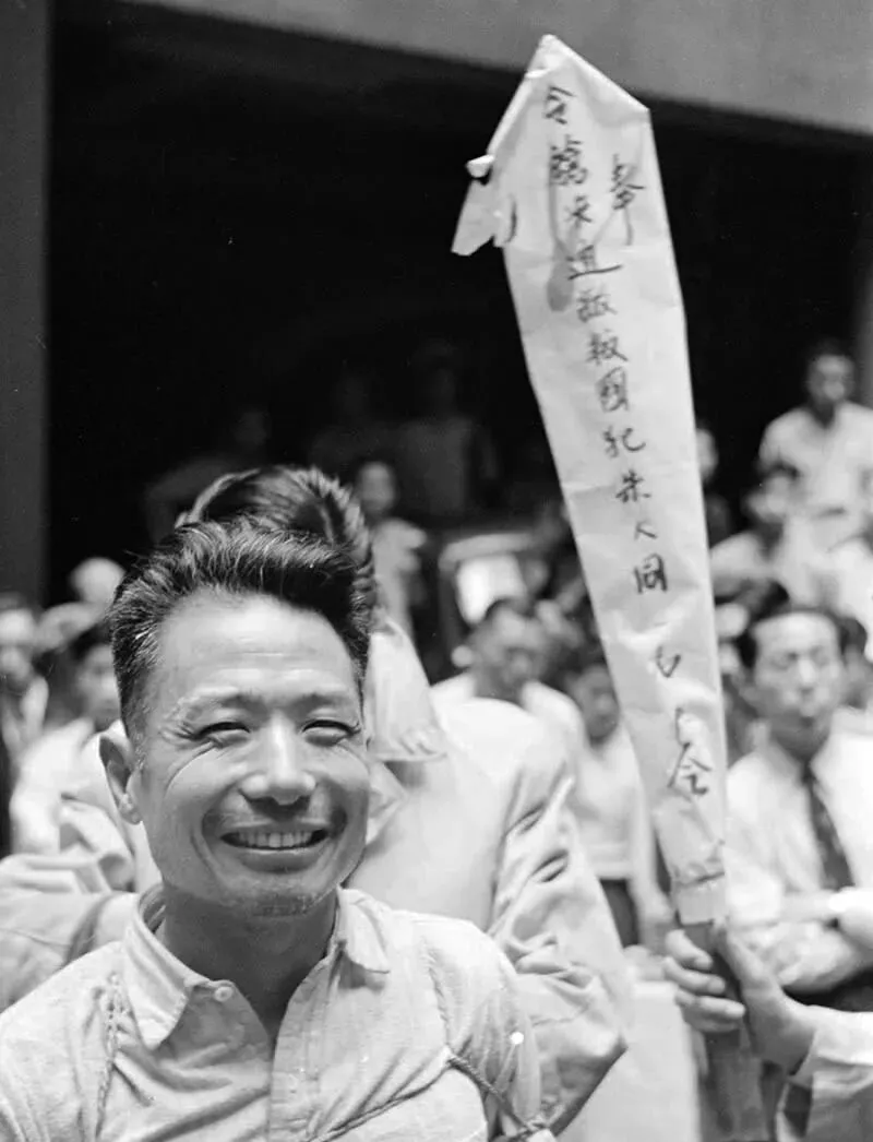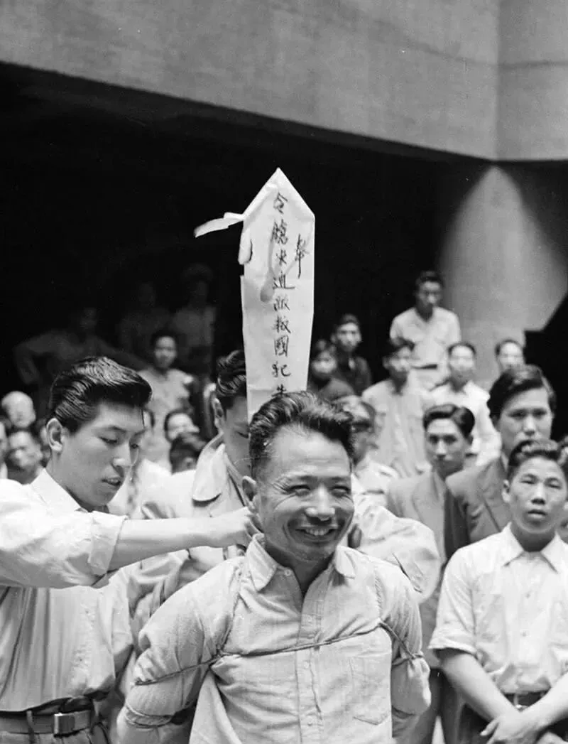 这张脸上是笑,眼角堆起细纹,牙花微露,笑得像在市集上与熟人打招呼,谁能想到他身后那根纸牌写着要命的字,笑不是轻狂,是一种把恐惧掰开来咽下去的劲儿,奶奶看这张照片时只说了一句,人这一辈子,有的人哭着活,有的人笑着死。