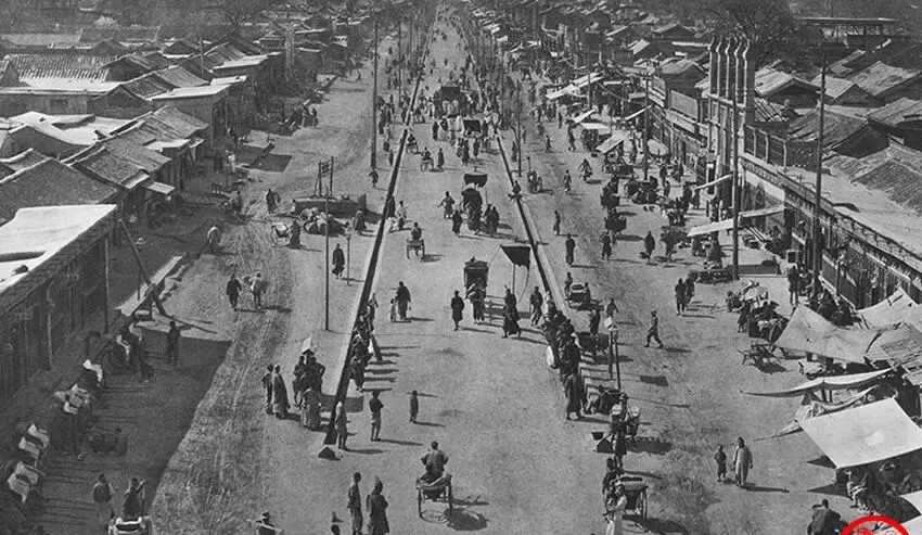 这条直直的就是安定门大街,中间轿车马车人力车掺着跑,两边铺子门帘往外探,旗杆子写着笔墨纸砚、药铺烤鸭,孩子光着脚丫追着糖担跑,掌柜站在门口抖账本,以前逛街要抬头看招牌,现在低头看屏幕,味儿不一样了,可热闹这俩字没变。